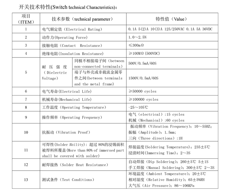 | 1 | Ηλεκτρική βαθμολογία | 0,1A 5(2)A 10(3)A 125/250VAC 0,1A 5A 36VDC | |
