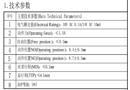 | 1 | Ηλεκτρική βαθμολογία | 10mA 14V DC/0.1A 30VDC | |